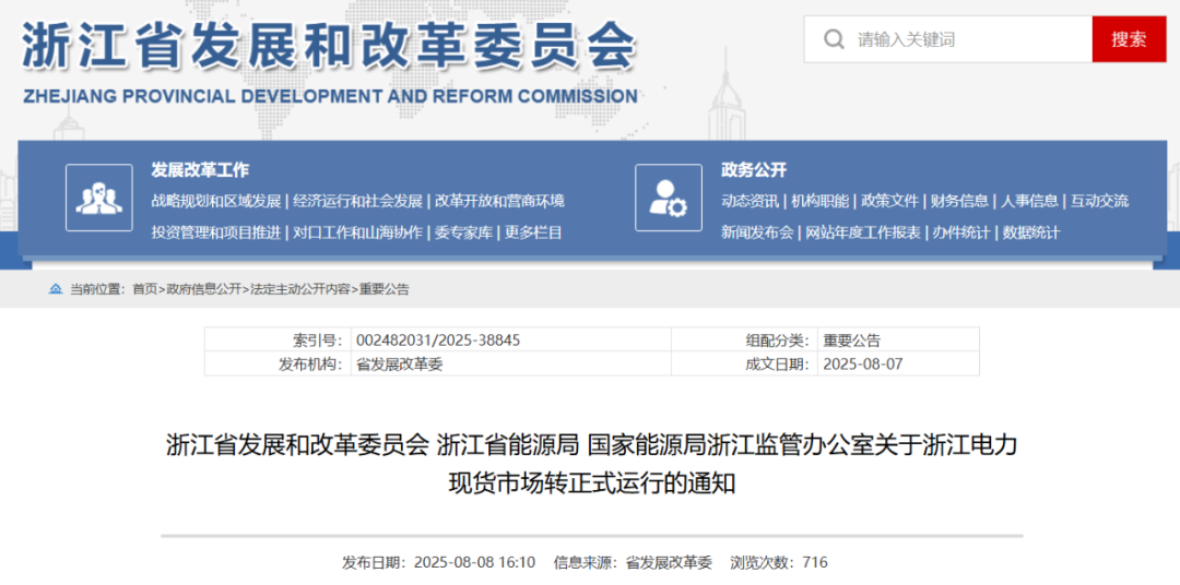 8月8日,浙江省发展改革委、浙江省能源局、浙江能监办发布的《关于浙江电力现货市场转正式运行的通知》指出,决定自即日起,浙江电力现货市场转入正式运行。