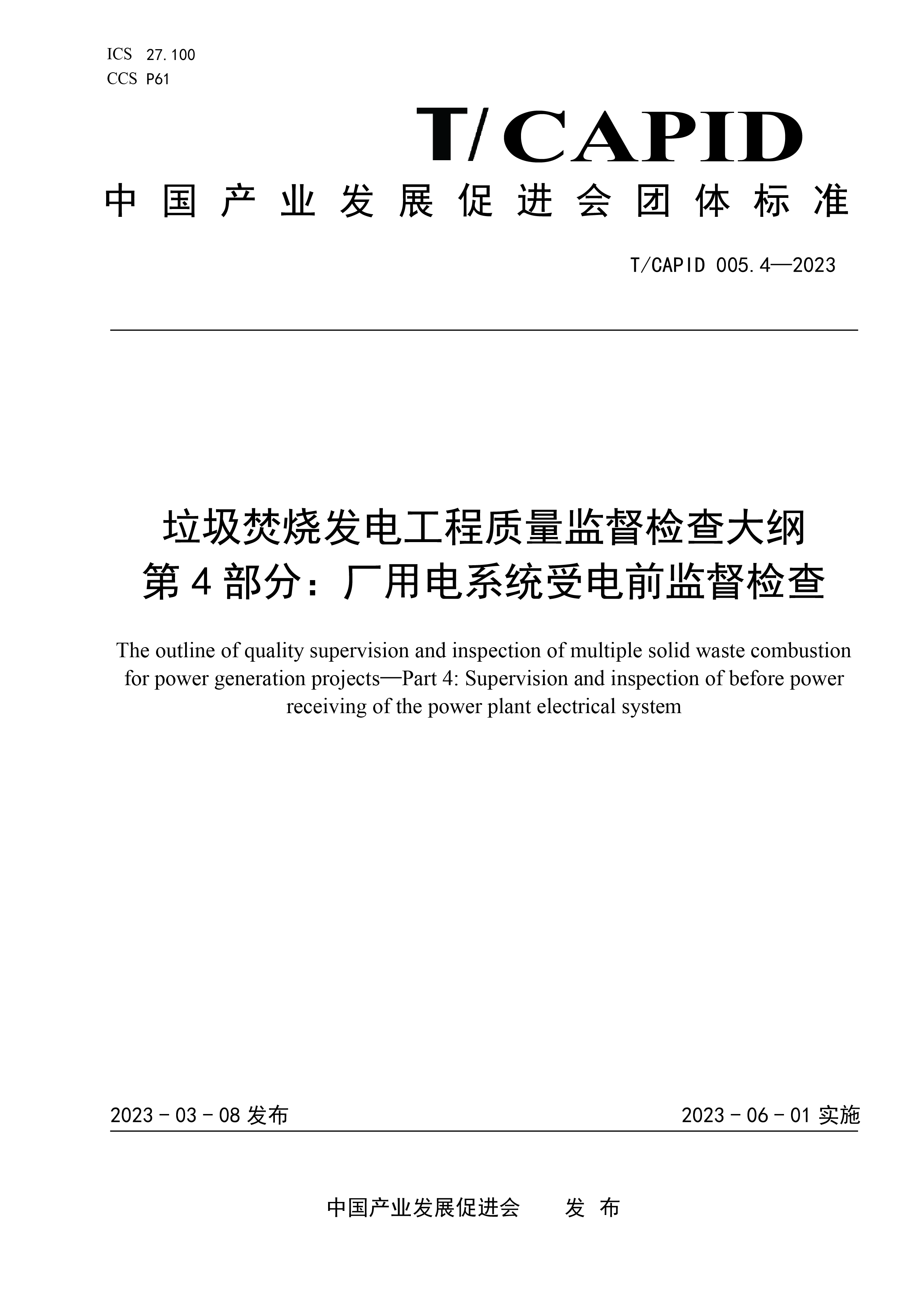 垃圾焚烧发电工程质量监督检查大纲 第4部分:厂用电系统受电前监督检查-发布稿